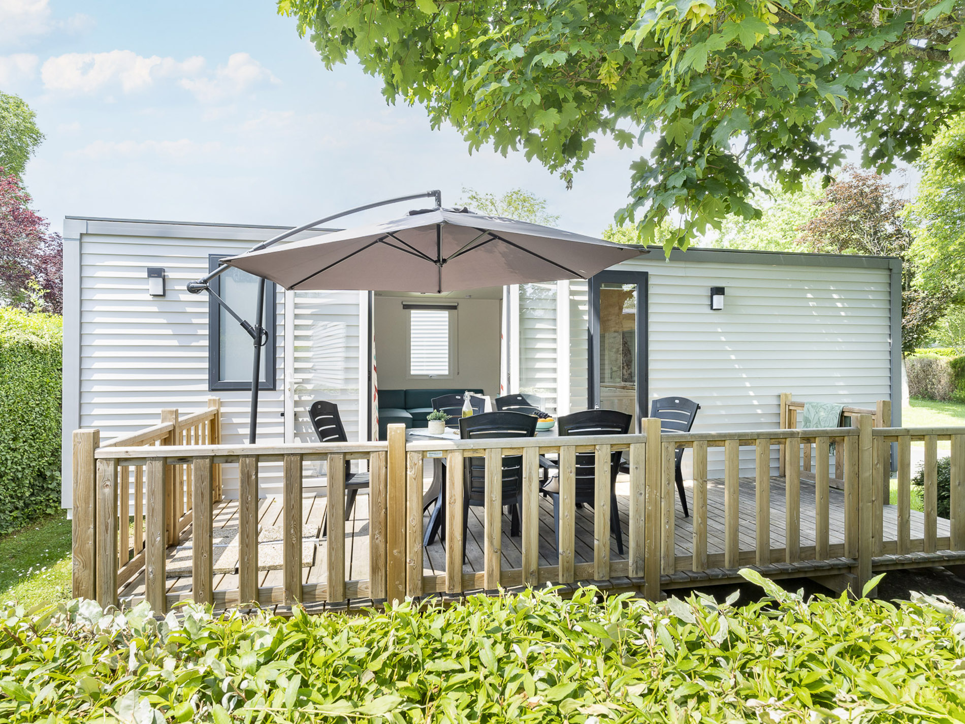 - Træterrasse (jordniveau) eller indbygget træterrasse, Parasol el. pavillon