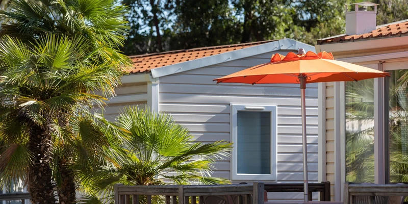 - træterrasse, med parasol