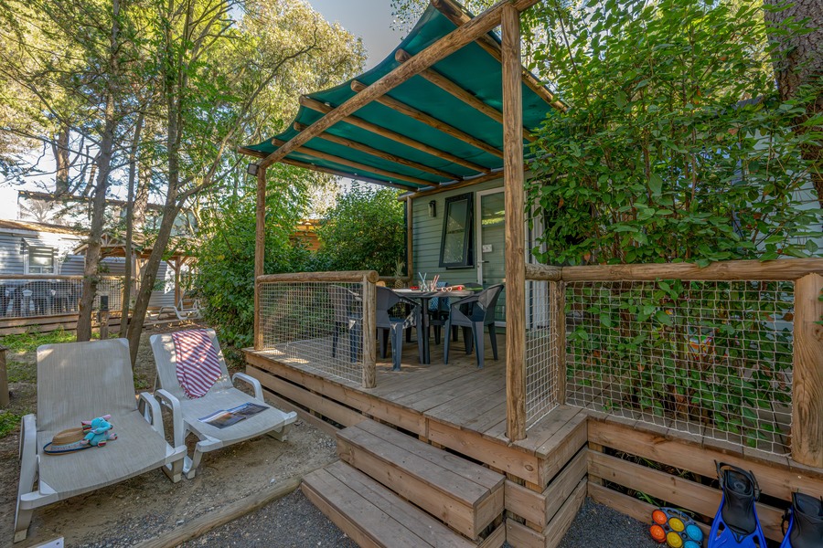 - træterrasse, delvis overdækket