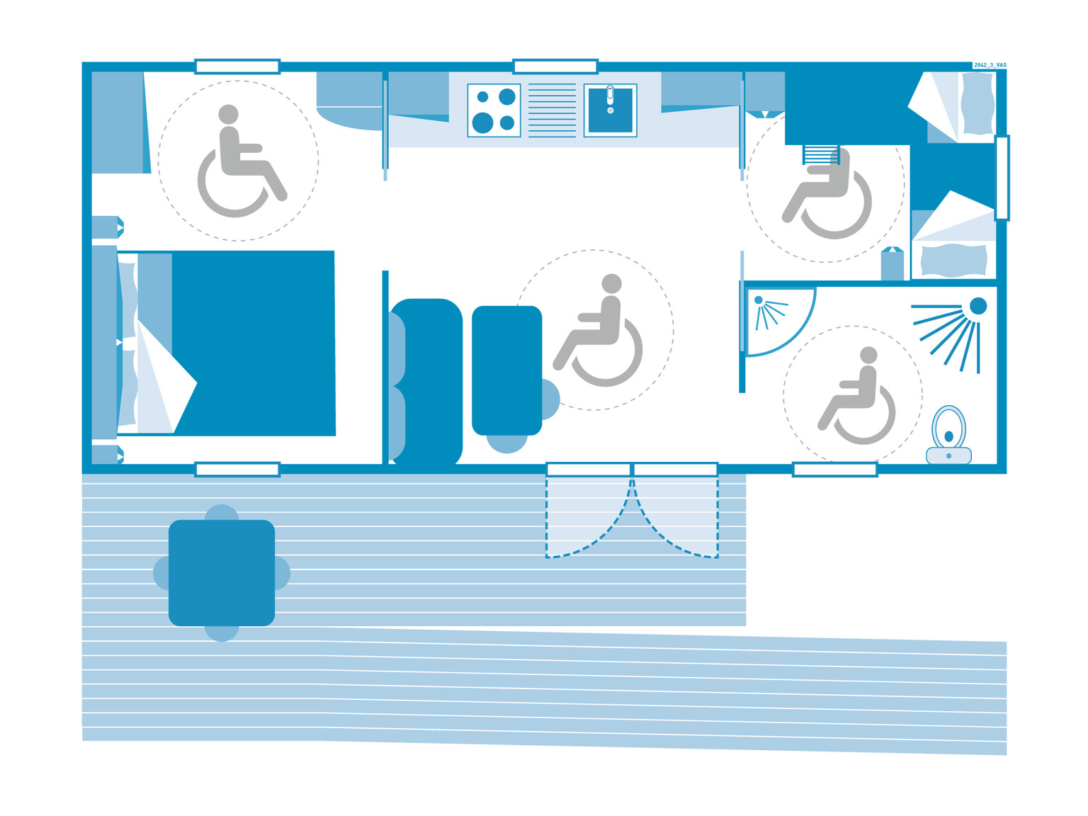 - træterrasse, delvis overdækket eller med parasol