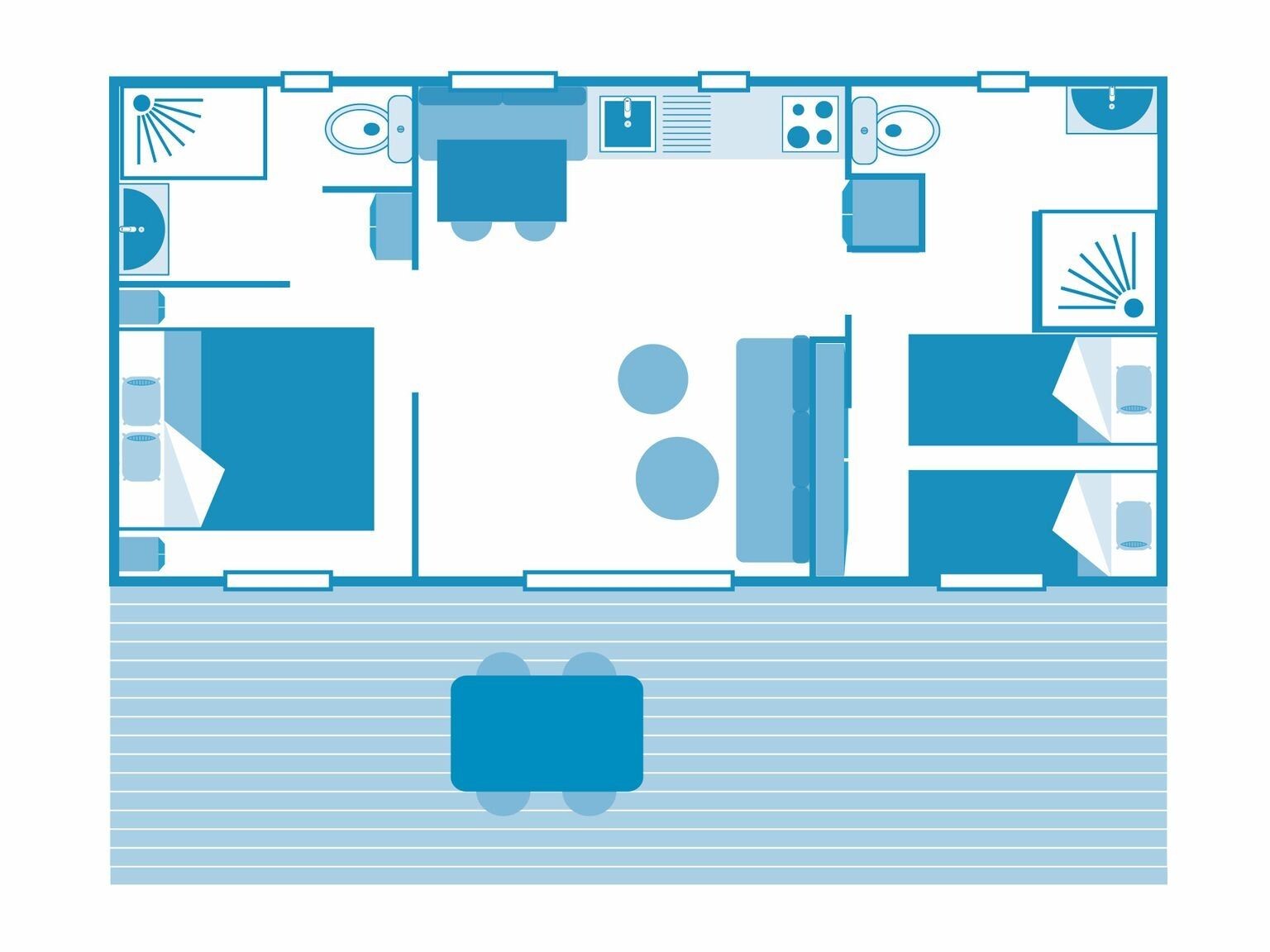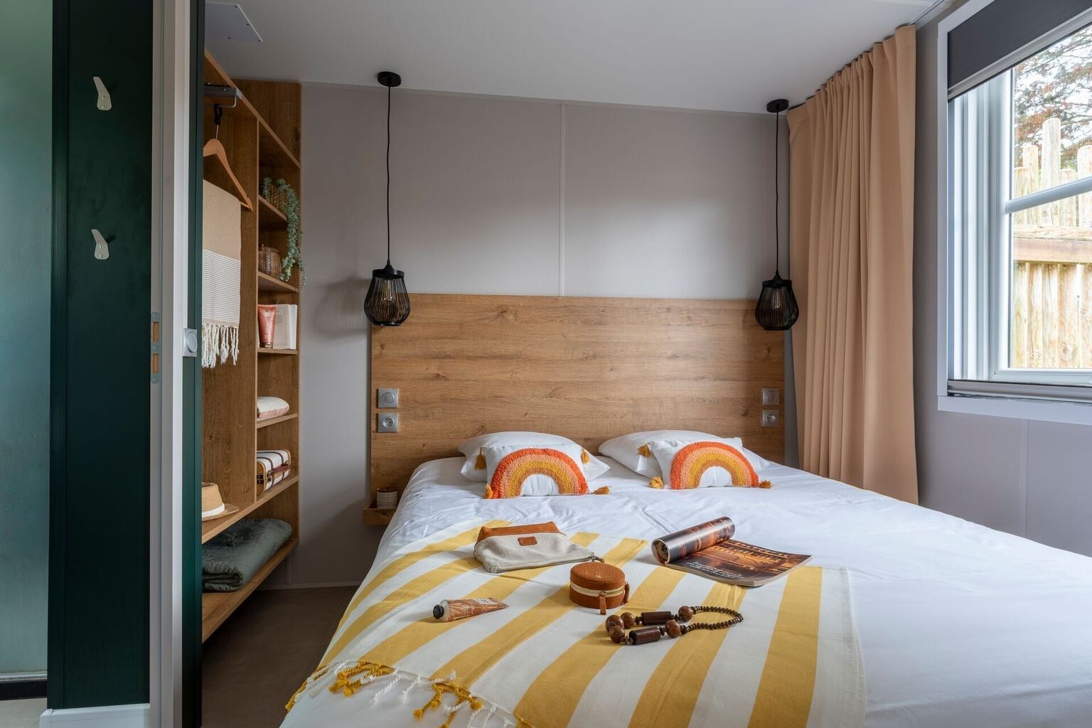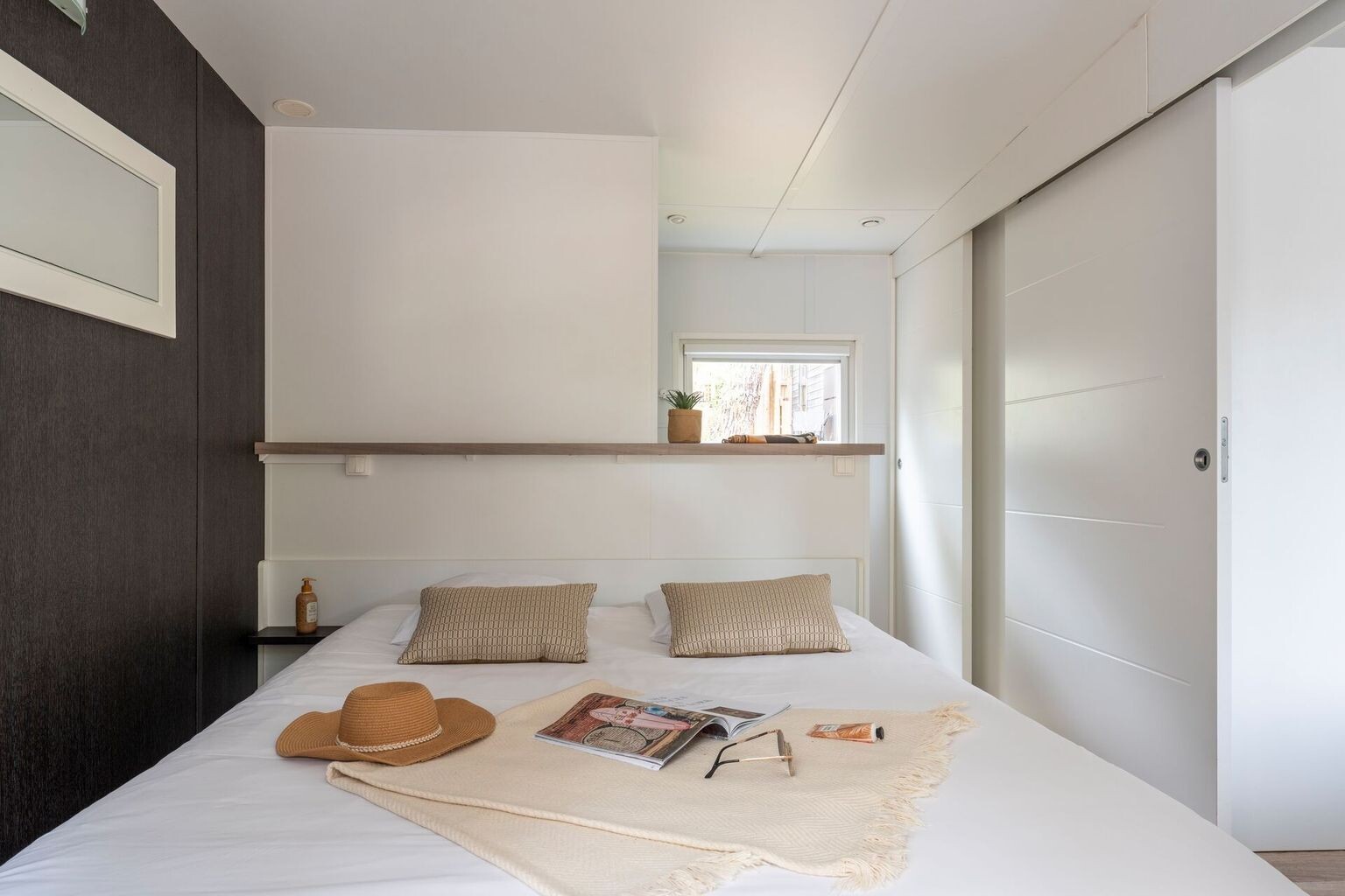 Den lyseblå pool, omgivet af palmer og glade børn, er campingpladsens midtpunkt. Den udendørs pool er rummelig, opvarmet og ideel til en forfriskende dukkert. For de mindste er der et sikkert soppebassin med muntert vandlegetøj, hvor de kan have det sjovt i timevis. Det store blikfang? Legeborgen i midten af børnebassinet. Lige spændende nok til børn i alle aldre. Og så er der selvfølgelig stranden. Mindre end 100 meter fra campingpladsen ligger den fine Plage de Gros Jonc. Du går bare derhen med dit håndklæde over skulderen. Børnene med skovle, du med en bog. Her kan du bygge sandslotte, mens solen langsomt varmer dine fødder. Om eftermiddagen kan man svømme i havet, og om aftenen kan I alle sammen gå på jagt efter skaller.