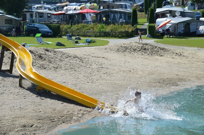 Campingpladsen ligger ved en smuk bjergsø, som indbyder til flere timers leg i vandet. Ved søen er der en lille strand, hvor de små kan bygge sandslotte. En lang badebro fører ud i vandet, hvor I også finder to vandrutsjebaner og en vandtrampolin. I kan også dyrke flere former for vandsport på søen, blandt andet vandski og stand up paddle.