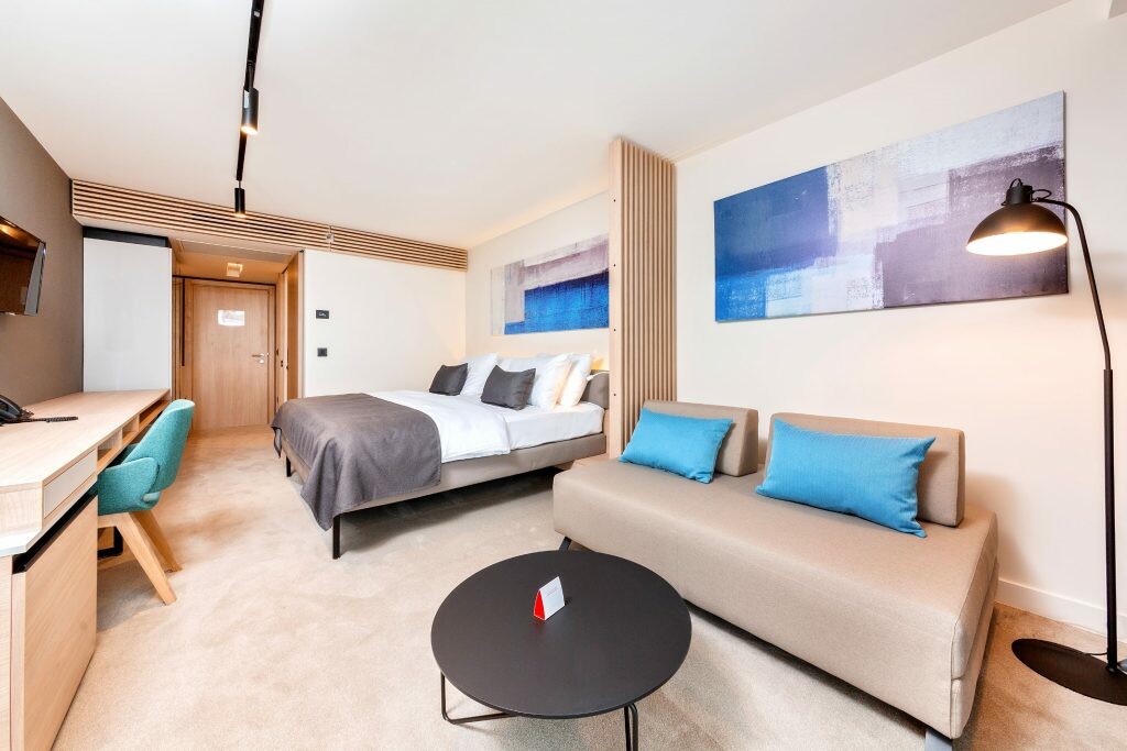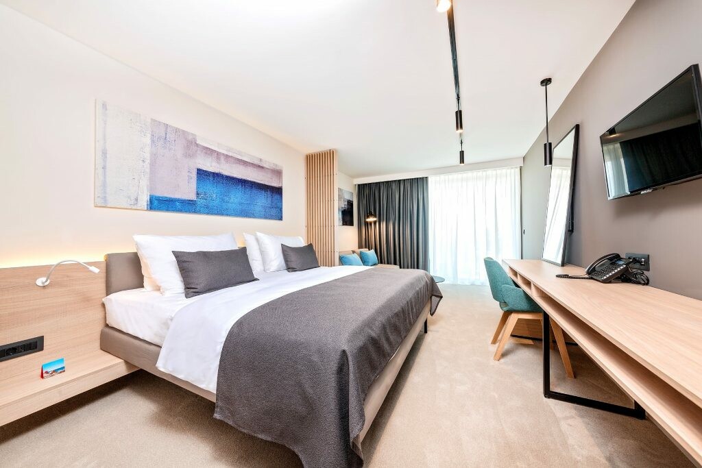 Ren afslapning venter dig bogstaveligt talt under dit ophold hos Resort Hotel Park Plava Laguna i Poreč. Bliv forkælet i wellness-centret efter alle spakunstens regler. Lad batterierne op, mens du soler dig på plænen. Nyd en kongelig middag i hotellets restaurant. Eller gå en tur gennem det eksklusive ferieresorts smukke have og lyt til fuglesangen. Hold dig i form med attraktive sportsprogrammer med en sjov faktor. Vandaerobic, tennis og fitness står øverst på listen over populære aktiviteter. Bagefter kan du forkæle dig selv med et velfortjent øjebliks rekreation med en frisk frugtjuice i strandbaren. Hvad angår underholdning, er der en miniklub og en børneklub for unge feriegæster og underholdning i dagtimerne for alle aldersgrupper.