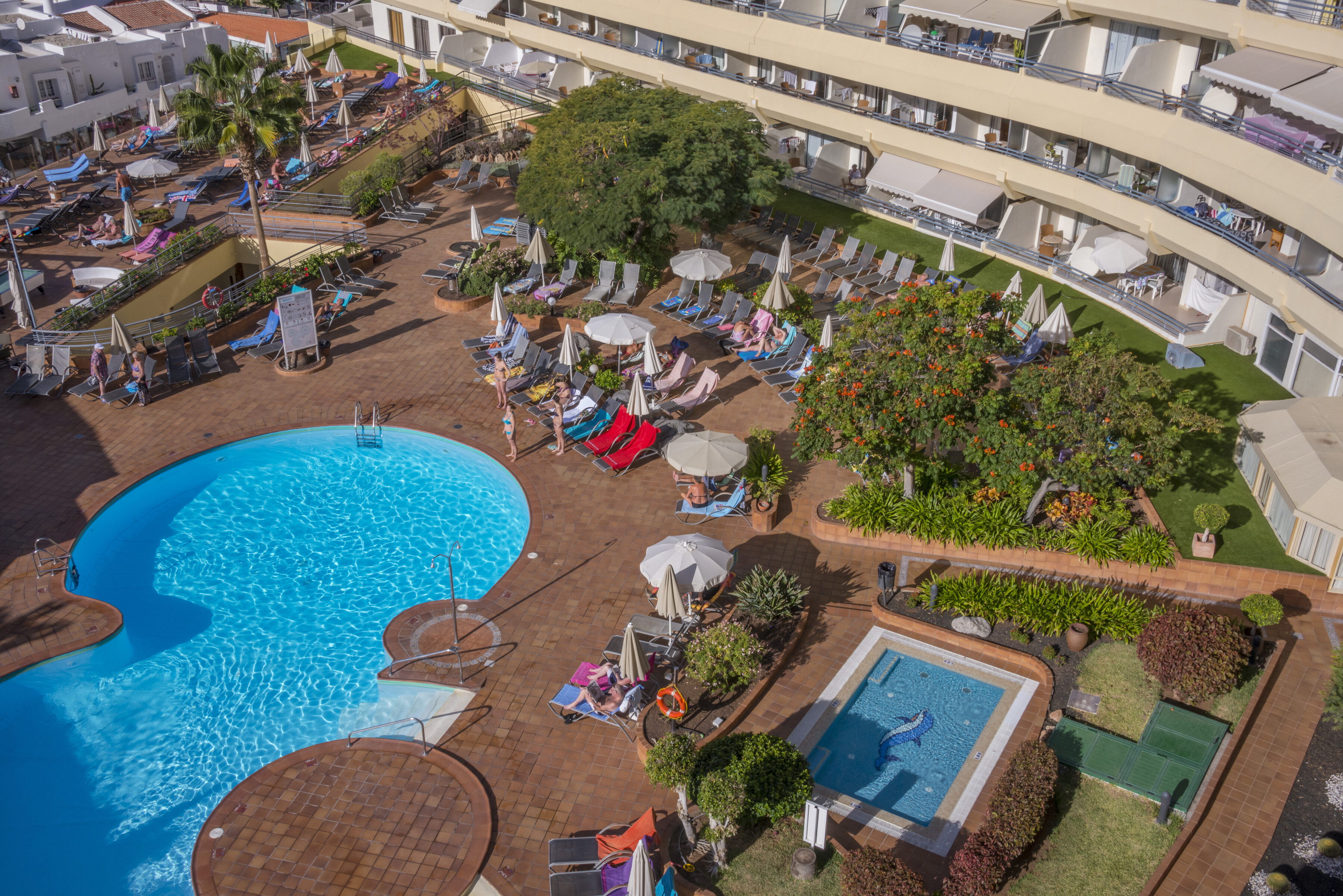 På Hovima Santa Maria kan du nyde en afslappet familieferie på Costa Adeje på Tenerife. Resortet har en åben og imødekommende atmosfære med en stor, buet udendørs pool, et separat børneområde og masser af liggestole til afslapning. Da vandet er opvarmet om vinteren, kan du nyde at svømme her næsten hele året rundt. Dette børnevenlige hotel ligger tæt på strandene Playa de la Pinta og Playa de Torviscas, så du nemt kan skifte mellem havet og poolen. Palmer, terrasser og komfortable udendørs siddepladser sikrer, at hele familien hurtigt føler sig hjemme.